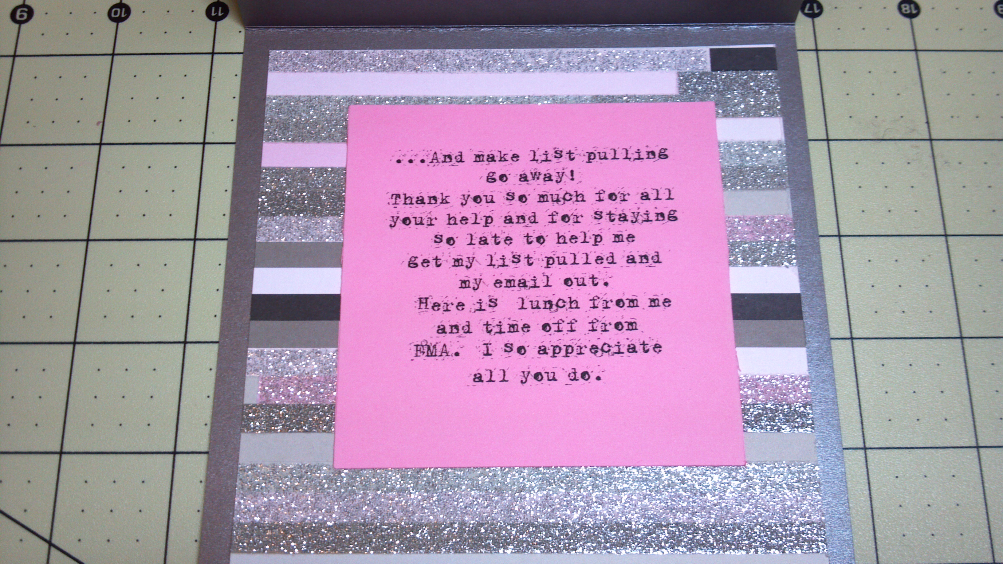 I thought I would show everyone the thank you card I made for a coworker who helped me out tremendously. I absolutely love the new Stampendous brand steampunk boot stamp I just got! I had to use it ASAP! Thanks for stopping by.