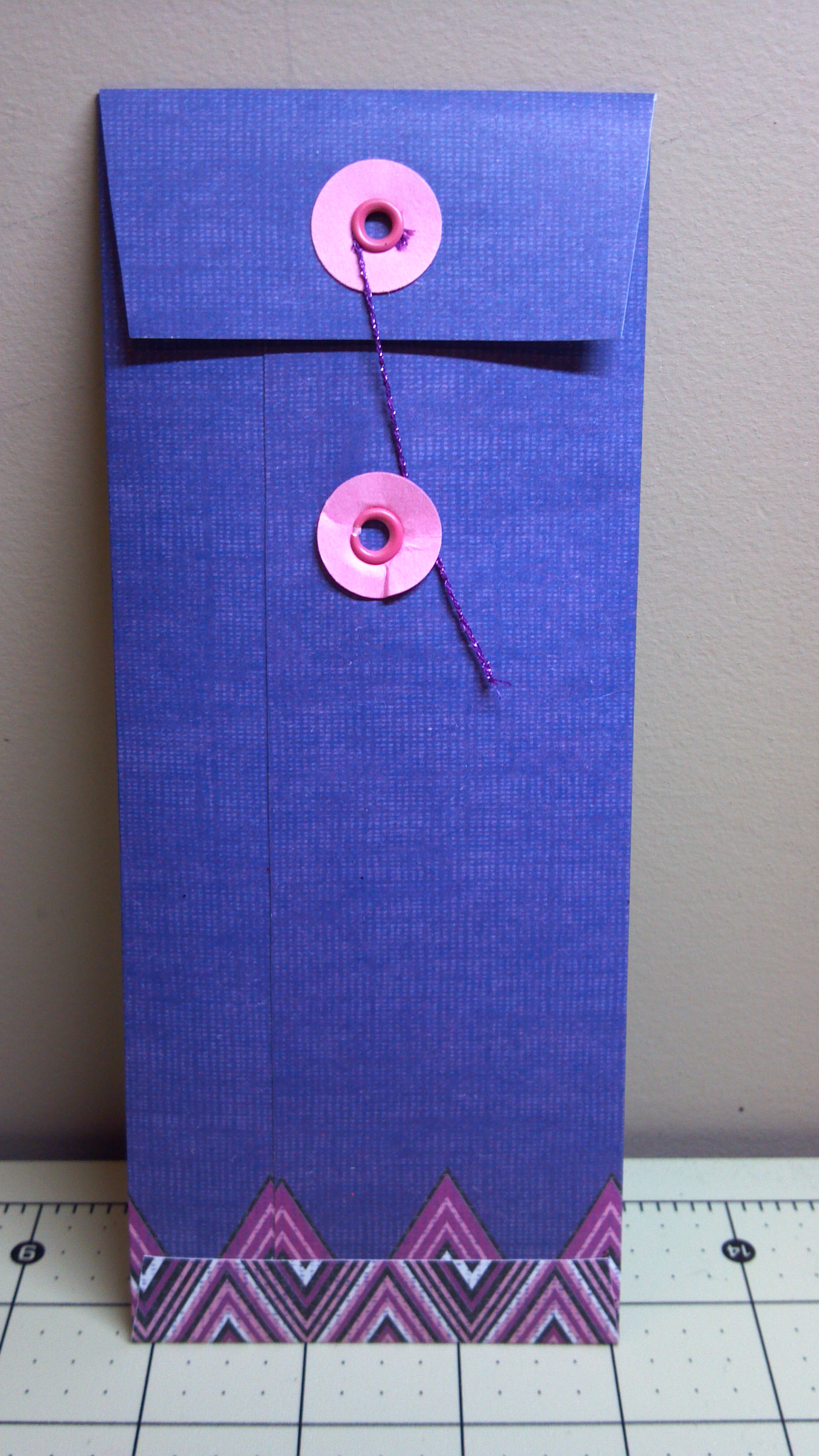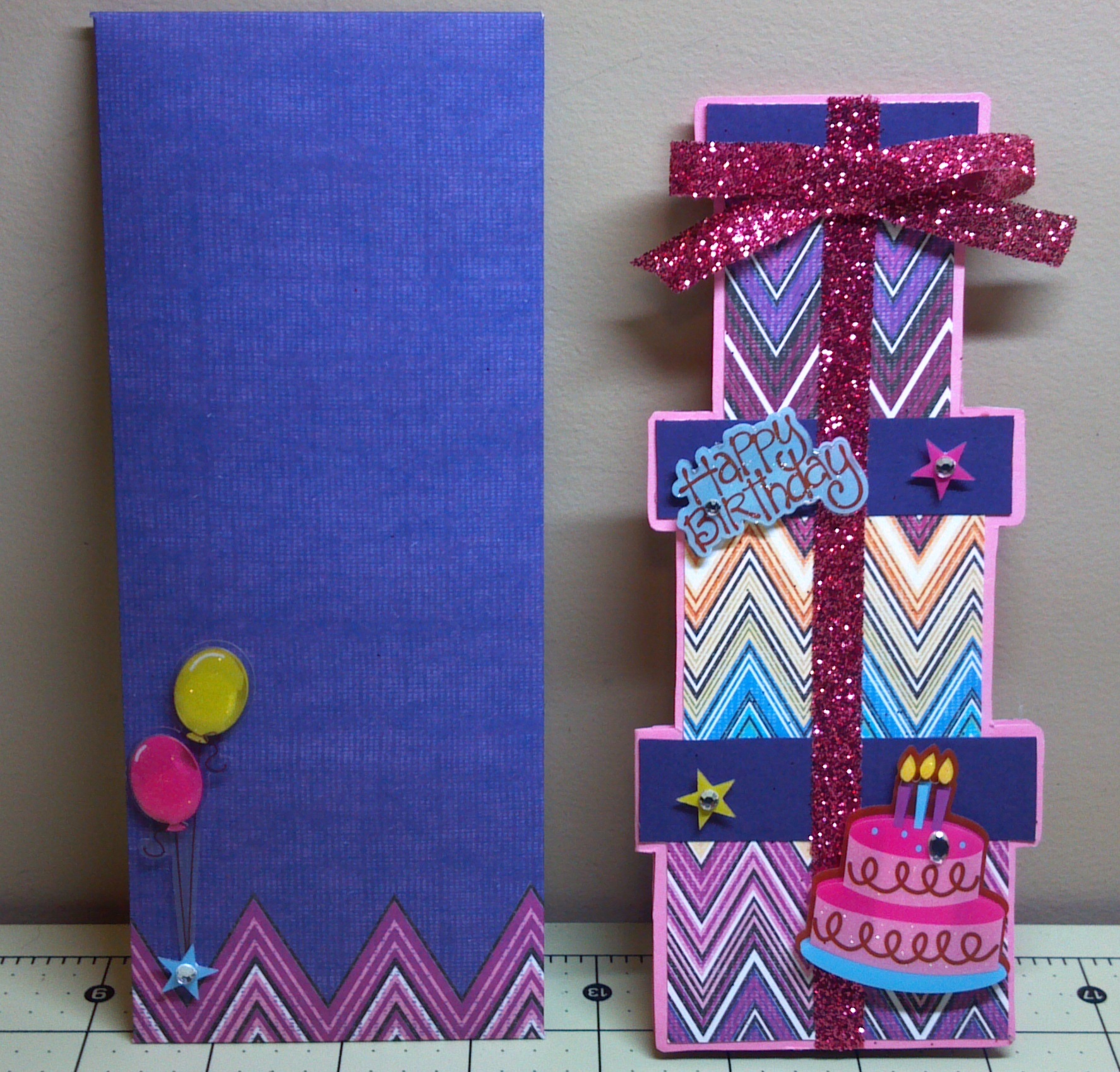 I really like the way my project turned out.  I gave it to a co-worker for her birthday this week and she loved it.  I used Recollections chevron patterned paper along with pink and purple solid cardstock and a few Recollections epoxy stickers from my stash and it came out wonderfully!  The file comes with ribbons and bows and sentiments, but I used glitter ribbon and my own stamp for this project.  I have also found a use for all the eyelets I got with my Crop-a-dile I got several years ago!