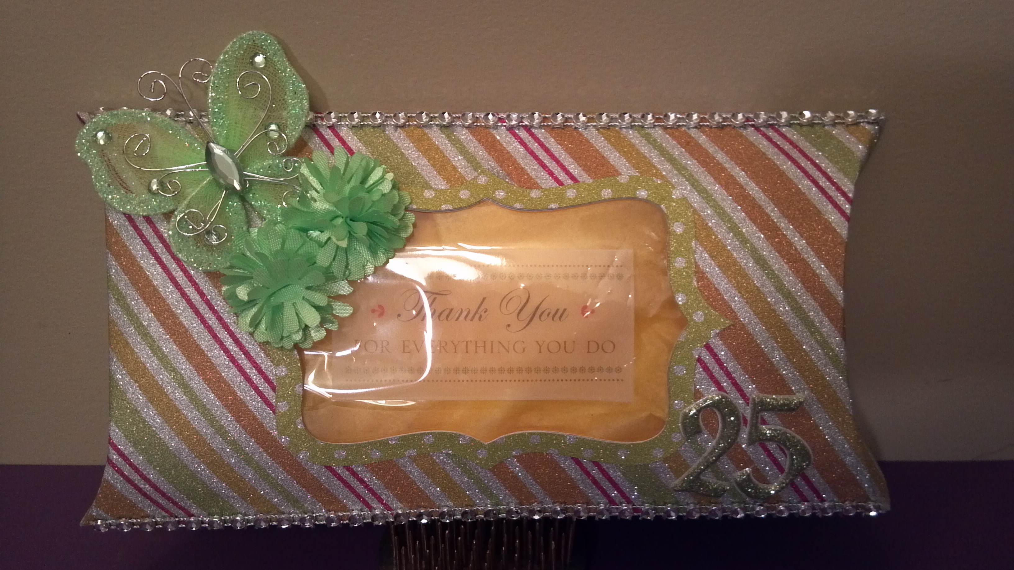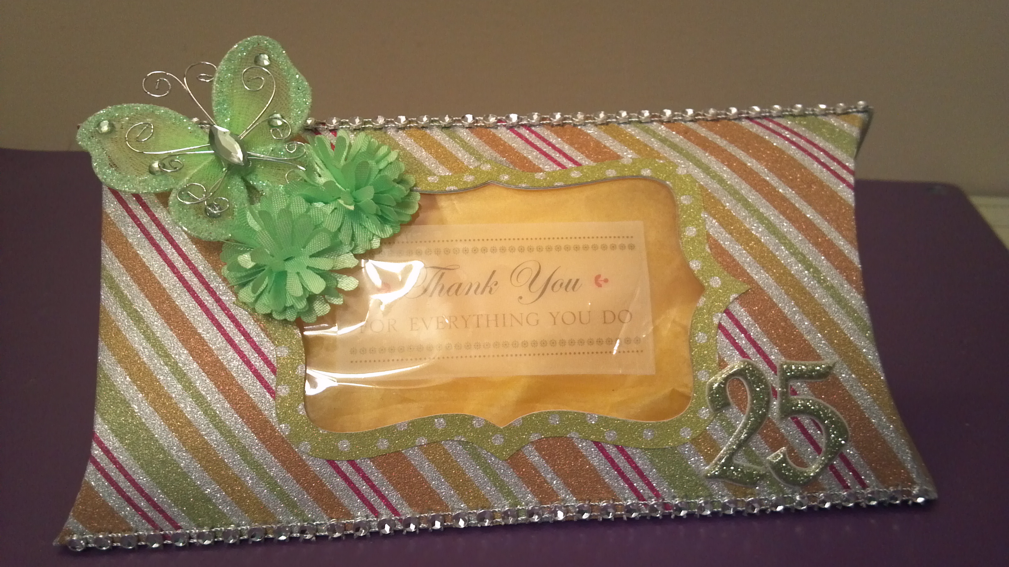 For my project, I used striped and polka dot glitter papers from DCWV, an Anna Griffin vellum sticker, some flowers, a butterfly, and Thickers to decorate the box.  Unfortunately I forgot to take a picture of the back which said happy anniversary but you can see it in the video below.  I gave it to one of my staff with a gift card for her 25th work anniversary.
