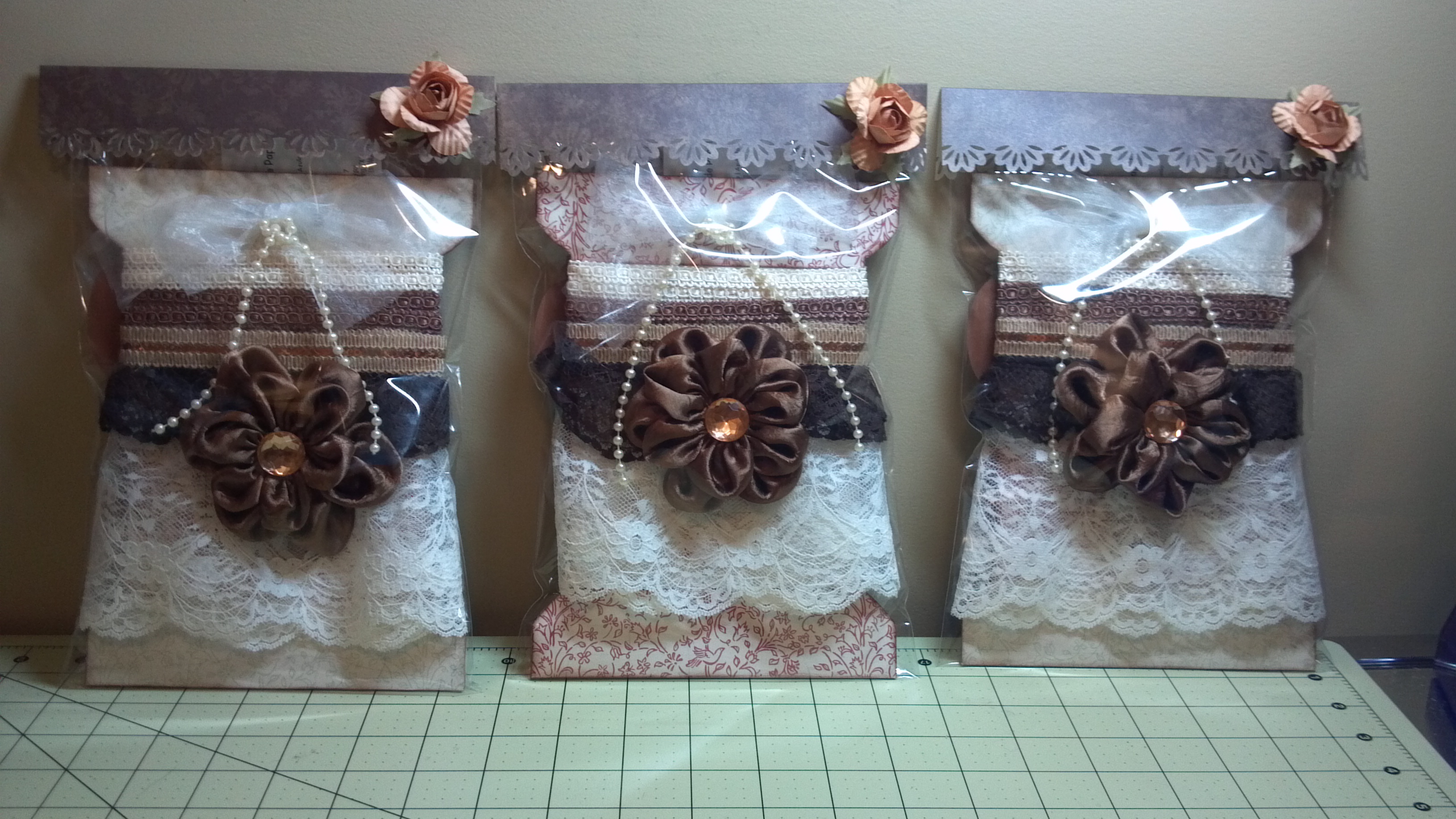 I participated in a swap on YouTube hosted by my friend Tmika (Scrapdaworld on YT) for which we had to make a stamped tag with some type of trim or embellishment at the top, a hand made fabric flower, and two embellishments, i.e. stick pins, charms, etc. Then we had to include three coordinating trims at least 24 inches each.