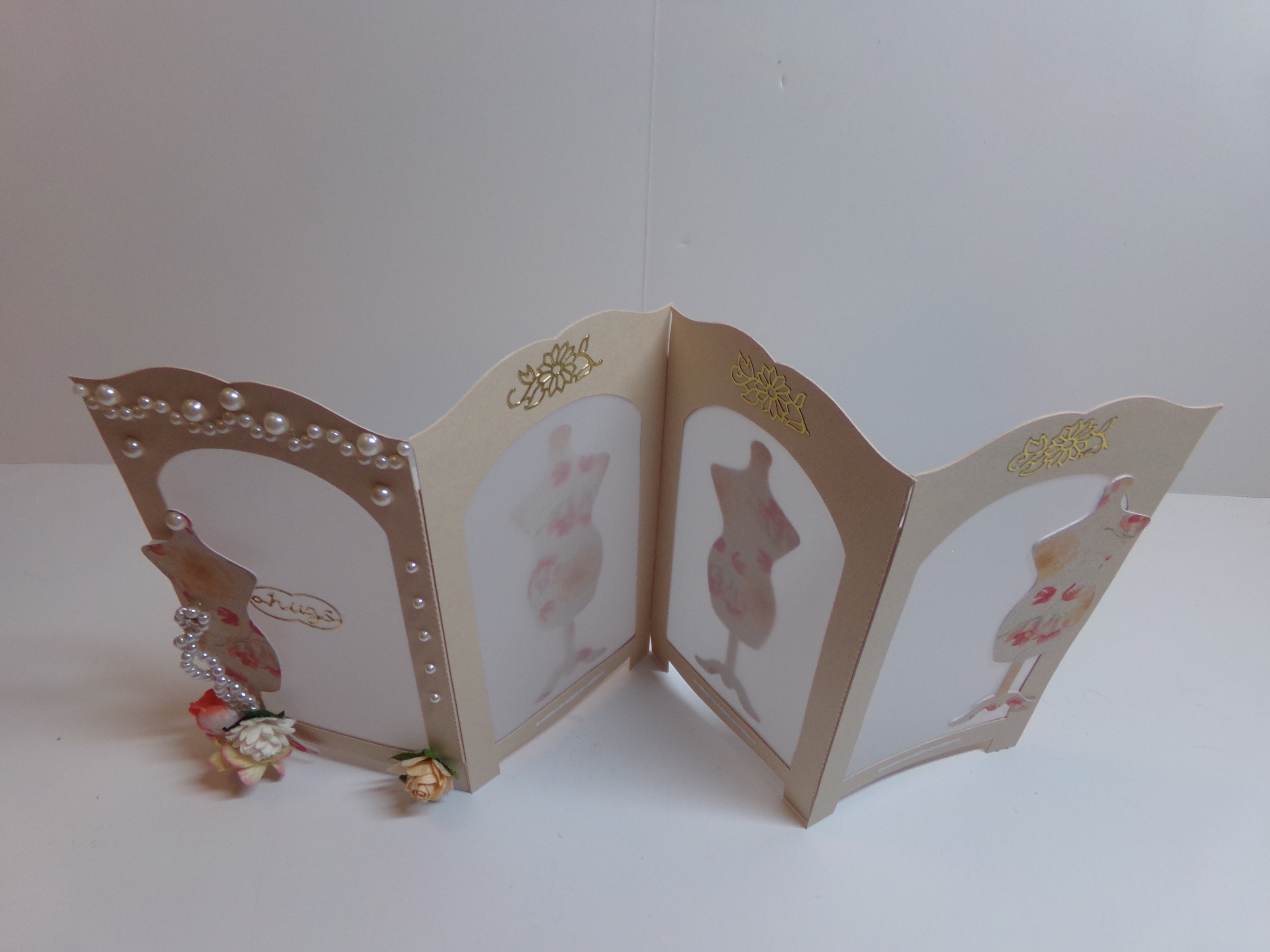 It is time for another design team project for The Cutting Cafe!  This time we could choose from the Dress Shaped Card, Dress Shaped Card 2, or Fun with Dress Forms which I used.  I love this file as I am a sewer and I love all things dress forms!  I decided to make a screen card.  These type screen are used as room dividers and you often find them in dressing rooms in fancy stores.  I thought a replica of a screen with dress forms was a cute idea.