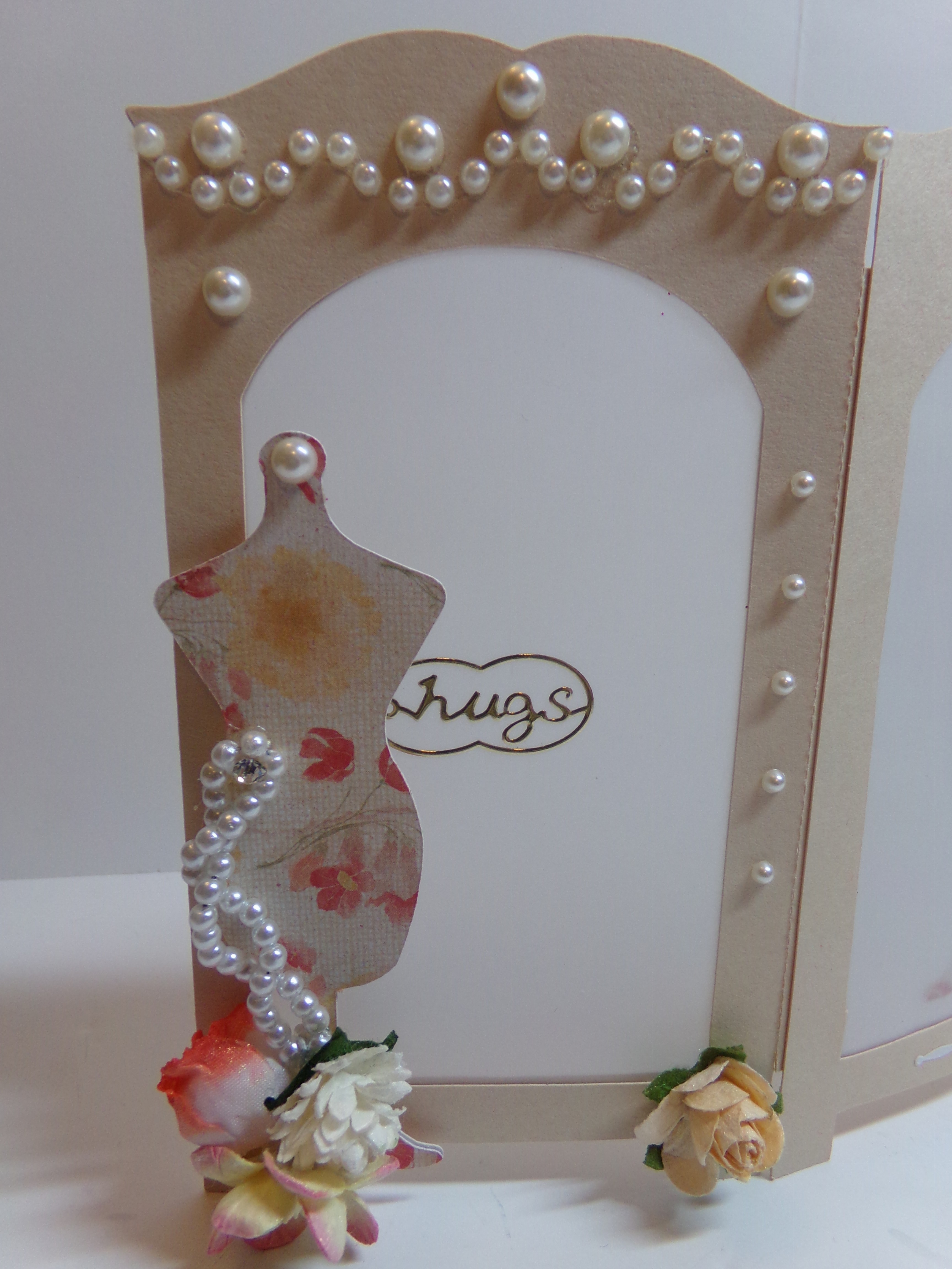 I used pearl bling on the front of the card along with some flowers from Wild Orchid Crafts and Alicia’s Glitz and More.  The pearl spray is a piece I have had in my stash my over 20 years.  I am trying to use what I have!