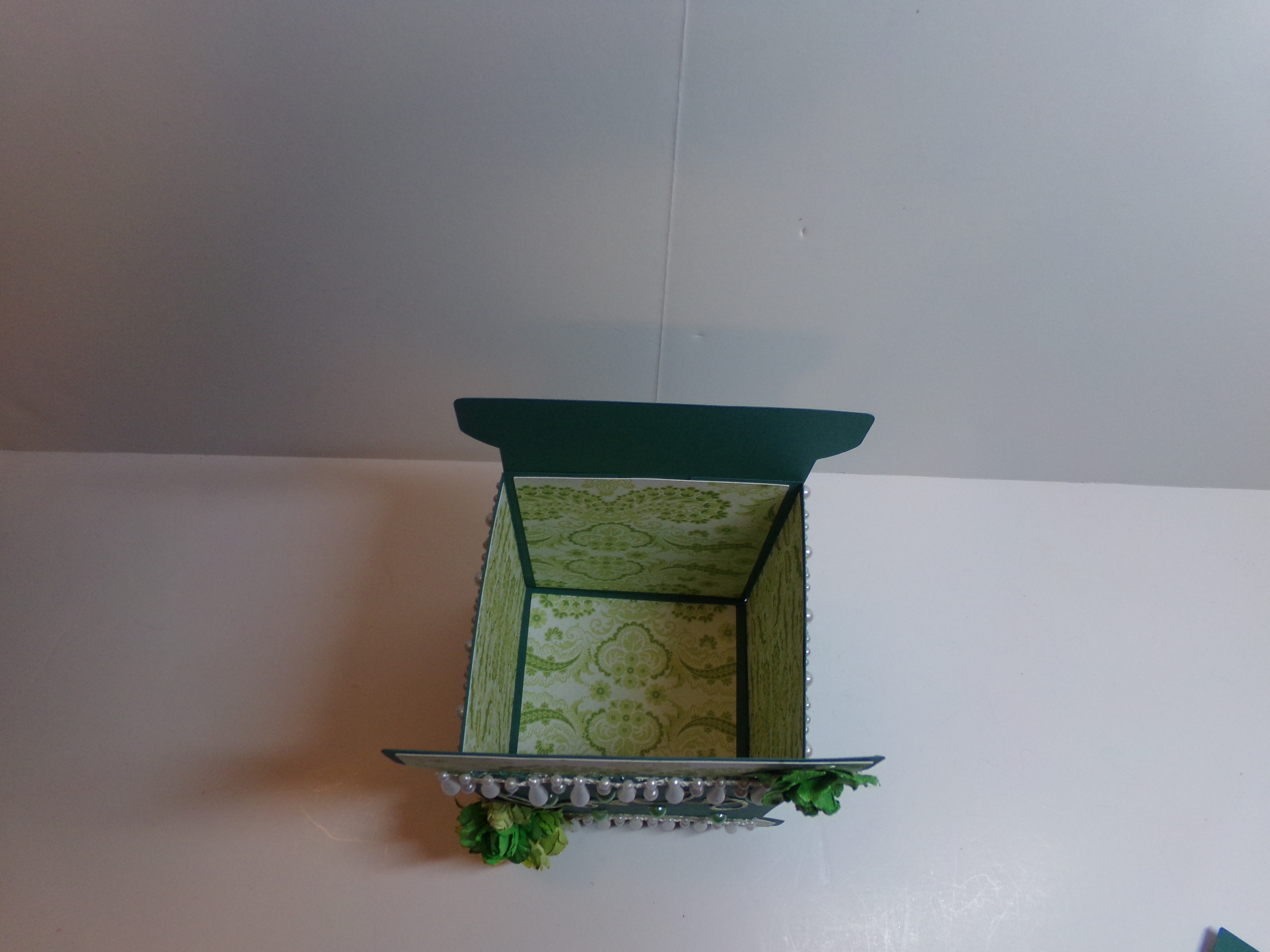 I added teardrop pearl strands, single flat back pearls, flowers, and a die cut word. I also added pearl bling on a roll to the top of the sides of the box.