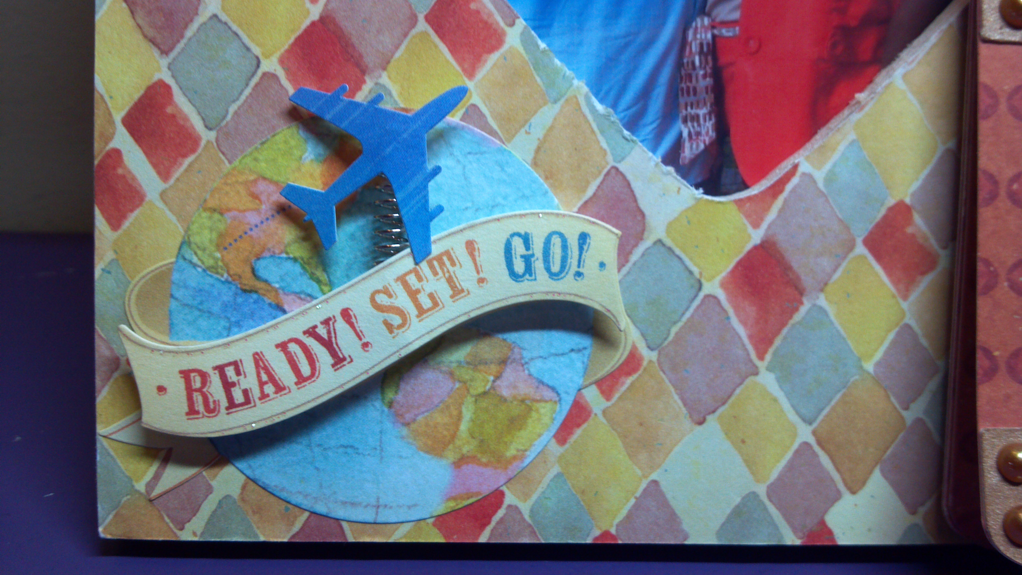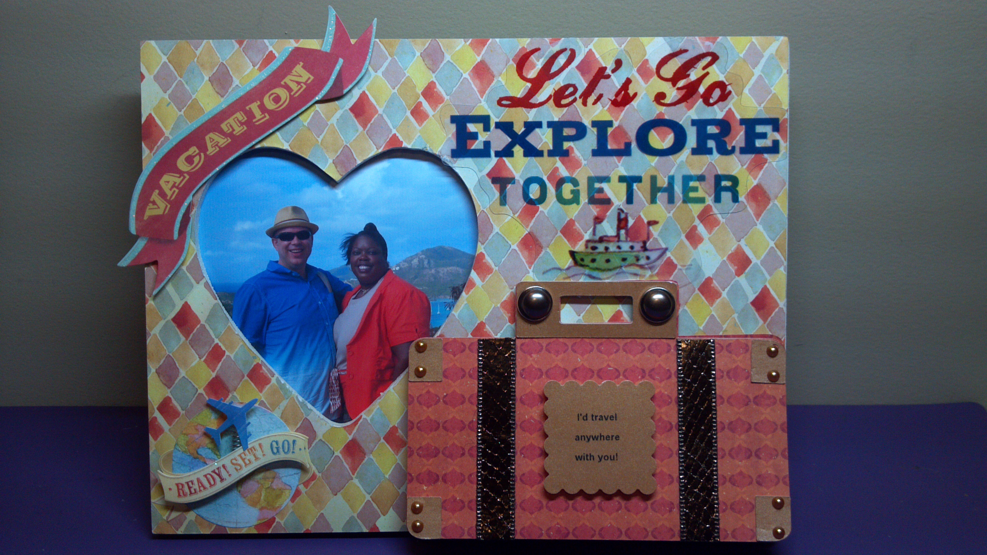 I have created an altered picture frame using the Suitcase Mini Book to add more photos (there are five pages under the decorated cover of the suitcase). I used K & Company’s Around the World by Brenda Walton paper and embellishments. I added my own sentiment, which I punched out with a scalloped square punch. The corners and handle also come in the file. The straps come in the file also, but I did not use them, instead using a snakeskin pattern ribbon. I used tiny flat back pearls as the rivets and framed pearl brads to hold all the pages together at the handles. This was a fun project! Here are a couple more views…