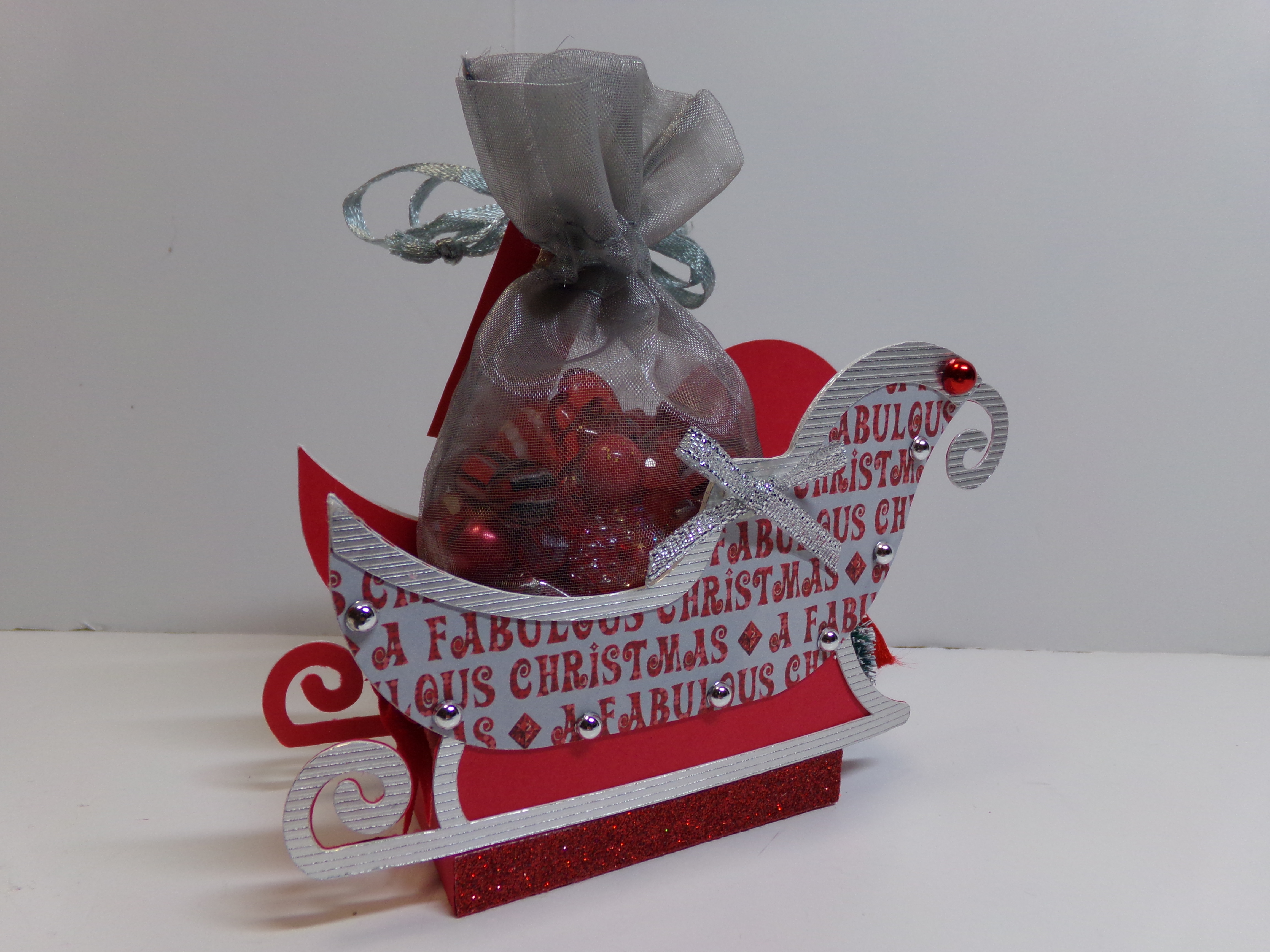 For my project, I made the Sleigh Treat Box. We could choose any Christmas file we wanted to and I had not done this one and thought it would make a good gift for a co-worker during the holidays. You can fill it with candy or a gift card. The file comes with may layers to give you variety. It also comes with sentiment tags (I made my own from a stamp as my printer was not cooperating) and several sizes of a flower.Here are a few other views of it…