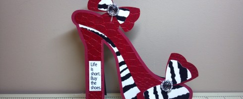 This week’s file from The Cutting Cafe was definitely up my alley! I love shoes and purses (hint hint) and this High Heel Shoe Shaped Card is the bomb, the business (ode to Shanta), and just plain fantastic! There are many layers and sentiments to help you make this your own. I could make 50 of them and they would all end up looking very different depending on the layers I use and the papers. Unfortunately, the picture does not really do it justice. The card is just awesome and the person I gave it to most definitely thought so!