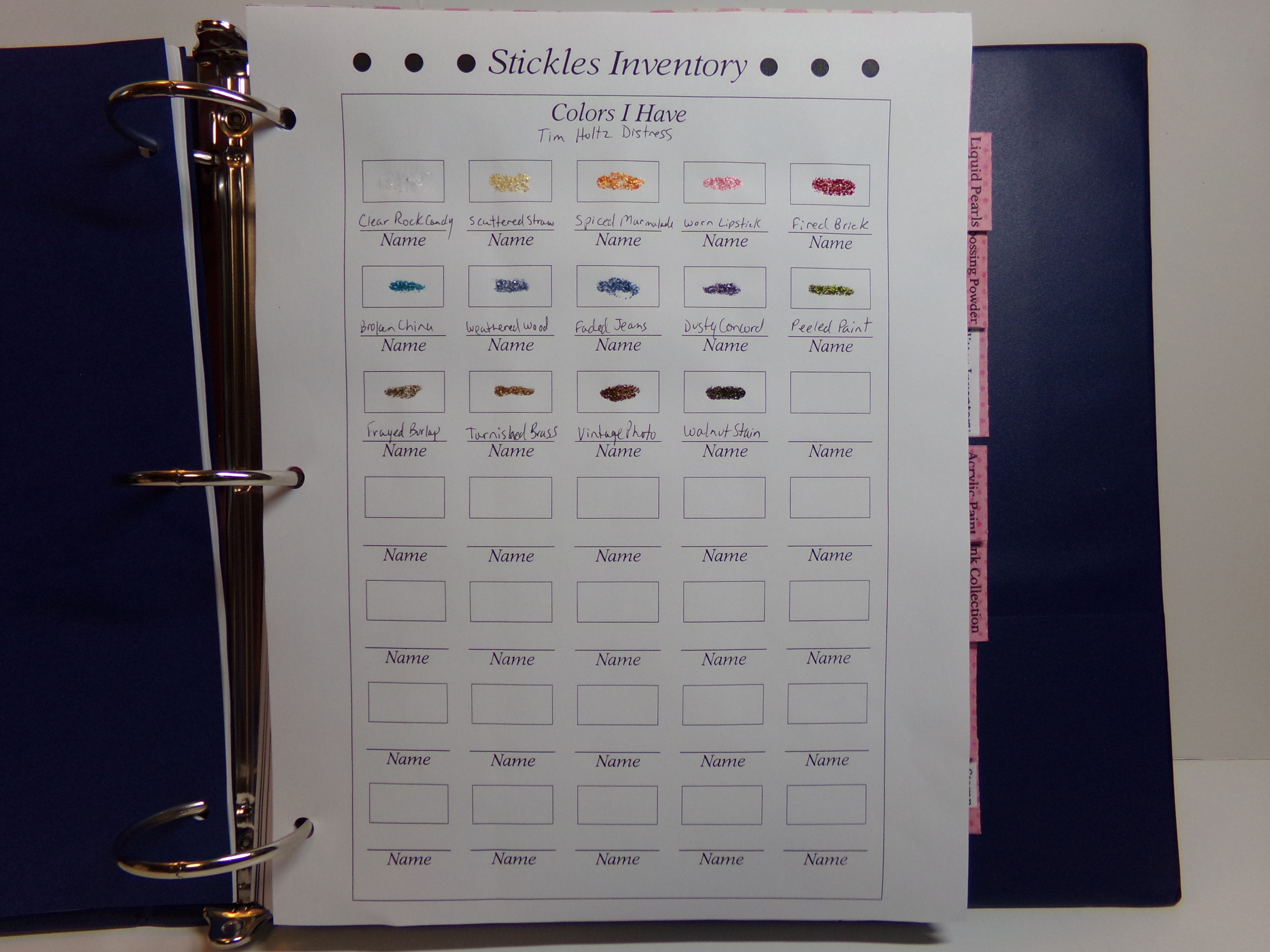 The file comes with a multitude of page options, both in color or black and white. There are pages for inks, markers, Stickles, embossing folders, cardstock, and many, many others. You can mix and match however you choose.