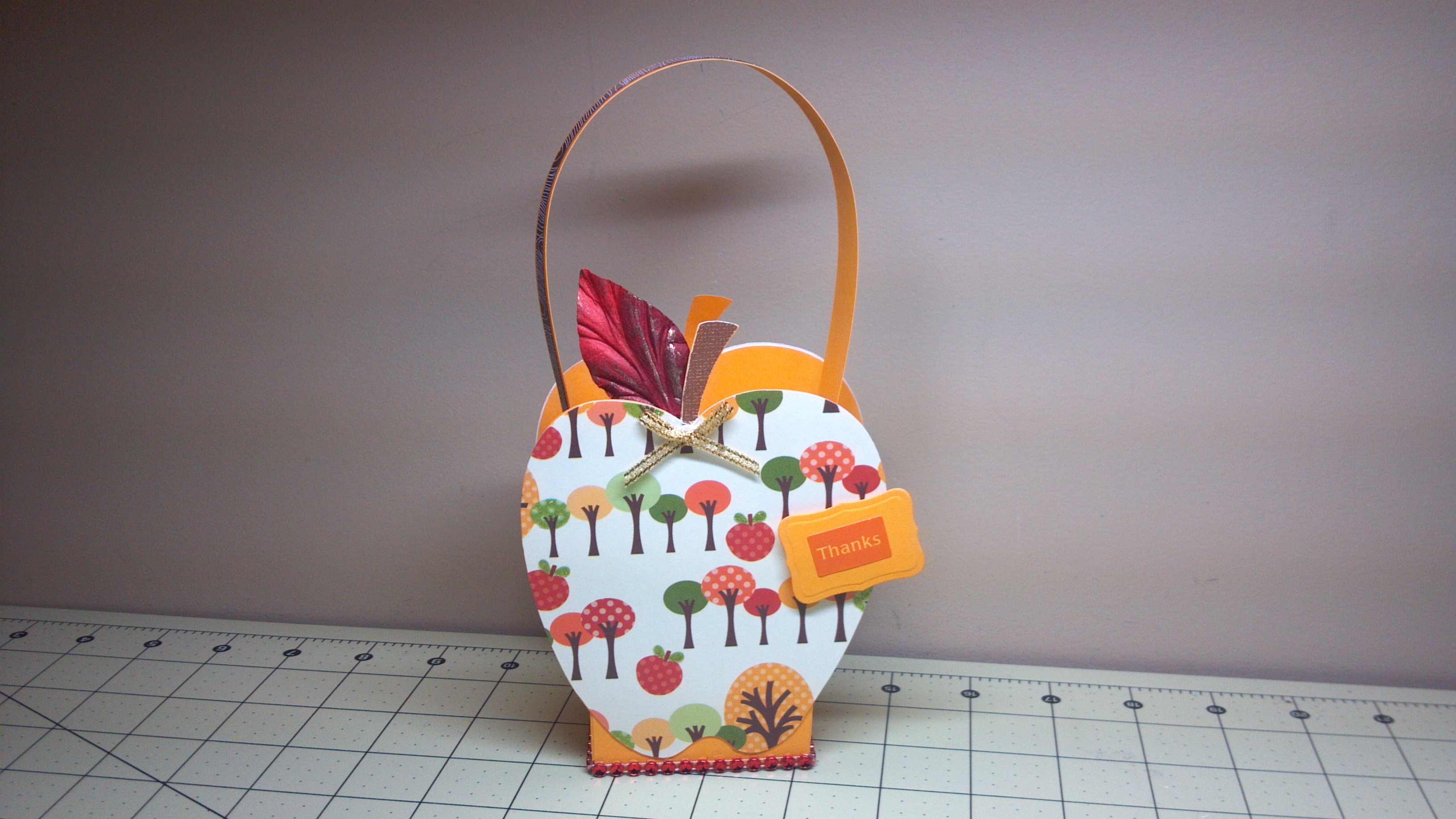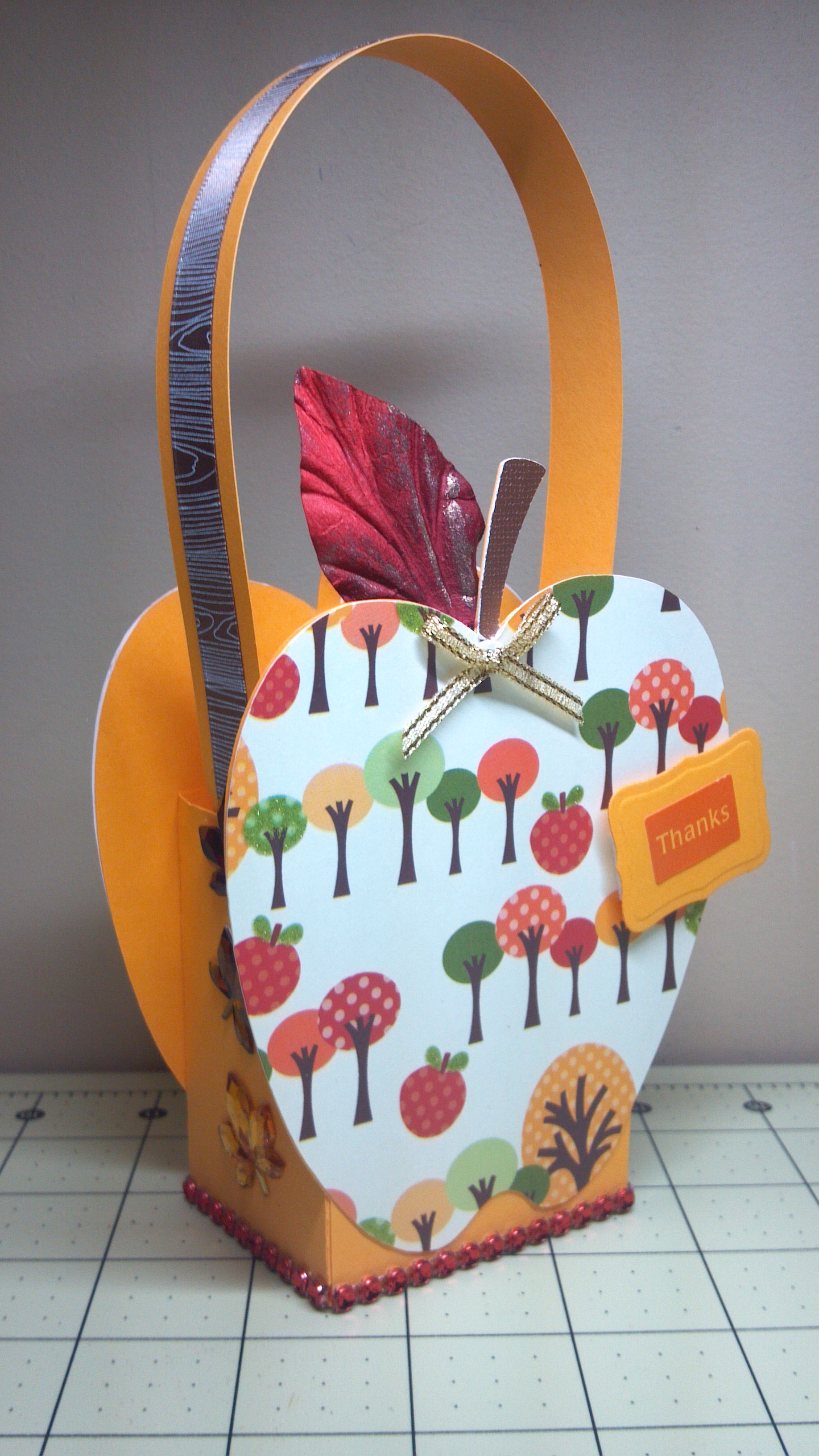 I used a cute orchard patterned paper, some bling leaves, bling mesh trim, and a woodgrain patterned ribbon. I finished it with a rust color leaf, a gold bow and a thanks sentiment. Here are a few other views: