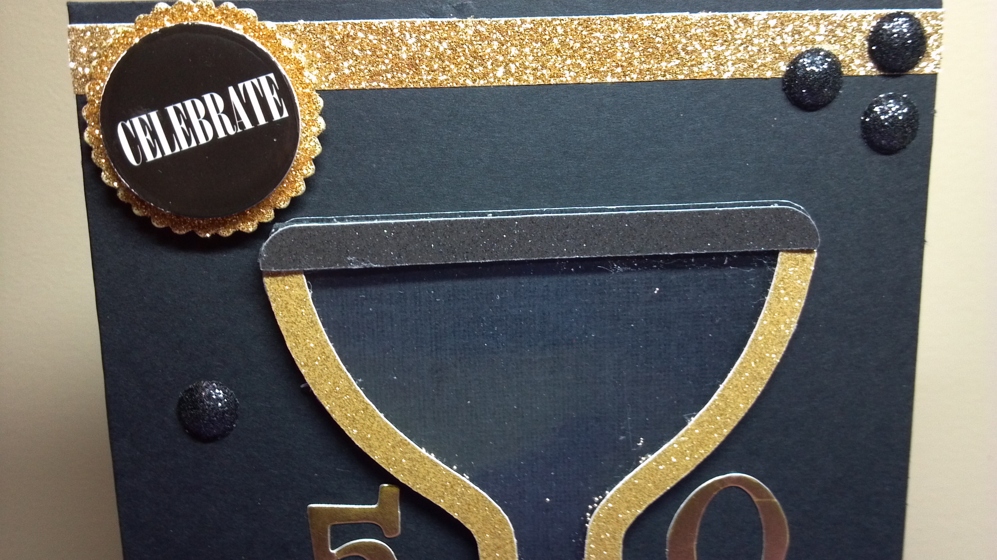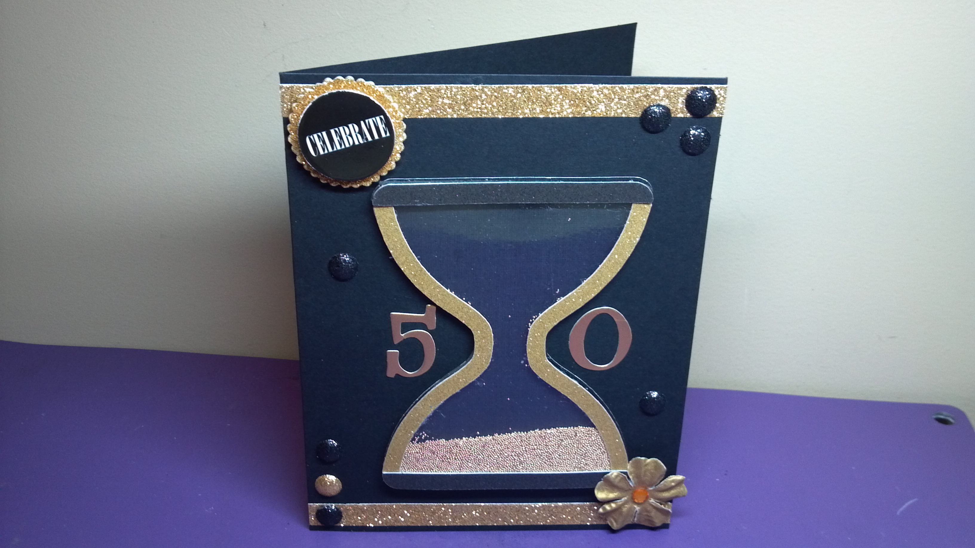 We are shaking up some fun at The Cutting Cafe this week with a whole new line of shaker cards! There are 13 different versions and you can find them all here! I used the hourglass version to make a 50th birthday card for a friend. Of course I used black and gold for the honor! I kept the card very simple in hopes of making the shaker 50 and the hourglass the focal points.