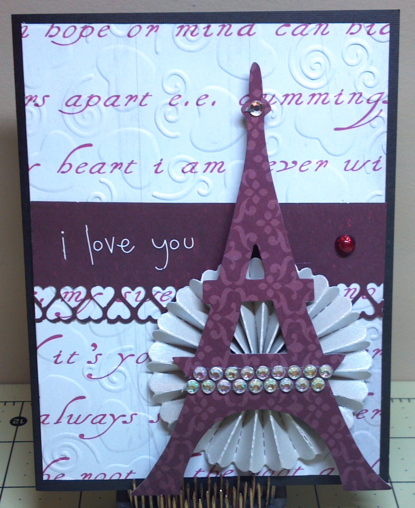 This file is a cutting file but with all of the files at The Cutting Cafe, you get many options. I used the PDF and just printed it onto red cardstock. I did not cut out the inside circles (which would have created the lace effect). I liked the way the bold outlines looked. I just Stickled a few hearts, added mesh bling trim, a ribbon slider and flat back pearl, and the sentiment. For the inside, I used the circle version of the sentiment I chose. It came in various formats (another plus with many of The Cutting Cafe files). I punched it with a Fiskars punch, and put it on a circle cut out with an EK Success punch. The inside heart is just a smaller version of the card.