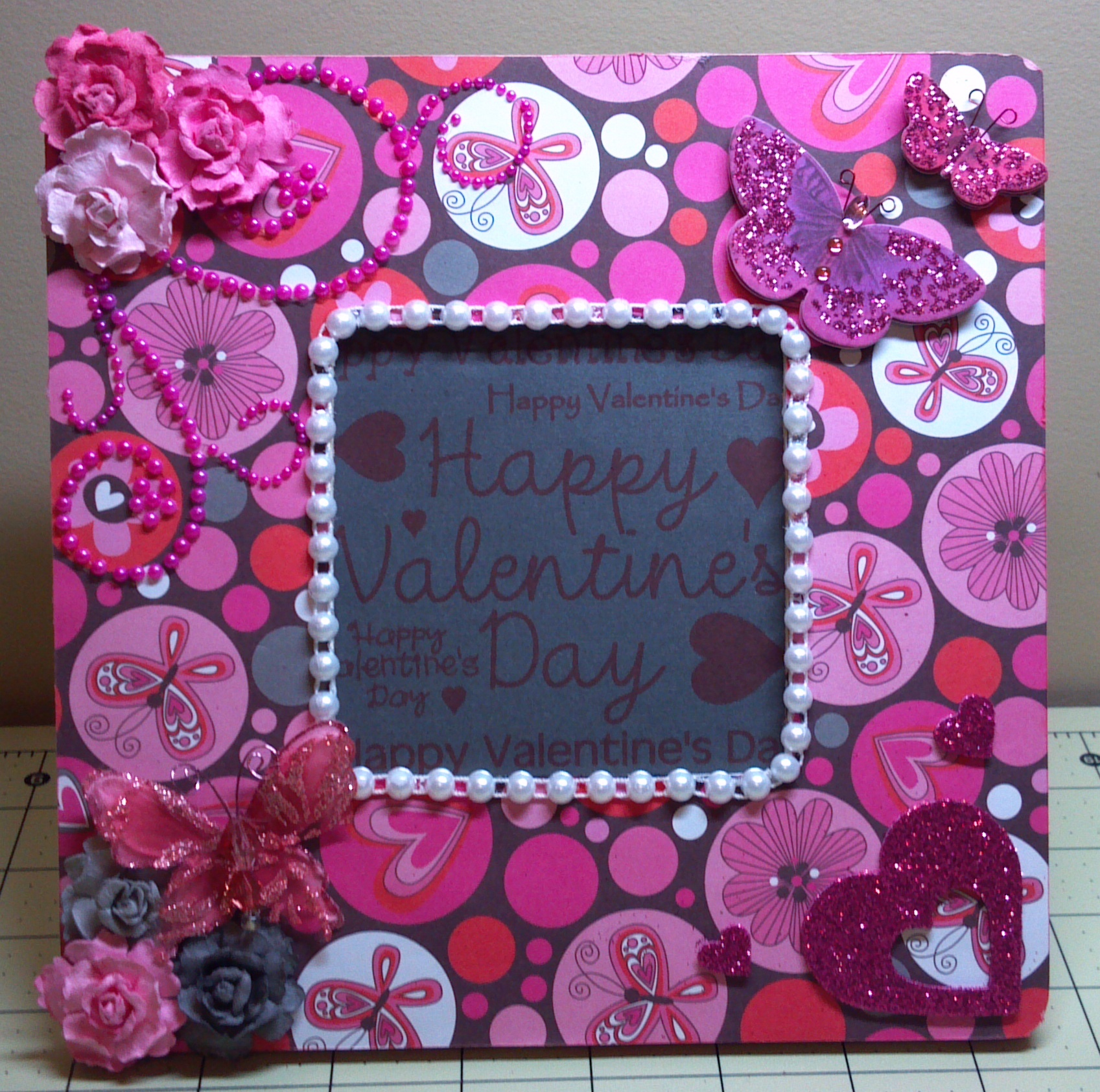 My altered frame used theValentine Mini Sentiments Backgrounds Printable Stamp Set. I used the Happy Valentine’s Day version in color. The stamps also come in black and white versions. The paper I covered the wood frame with was a bit mod 60’s but I liked it. I added some pearls, roses, glittered butterflies,and hearts. I think it is cute and I liked the way it turned out. This was a bit different for me but I like it.